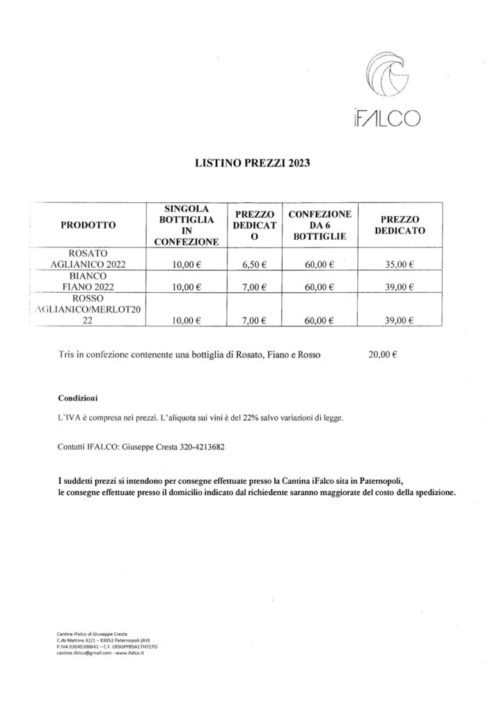 Cantine iFalco di Giuseppe Cresta C.da Mattine, 32/1 – Paternopoli (AV) tel. 320 4213682 sito: www.ifalco.it |