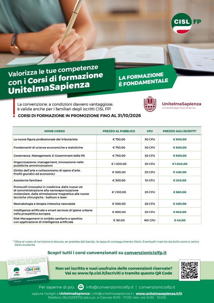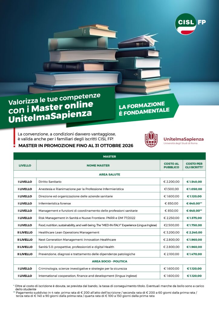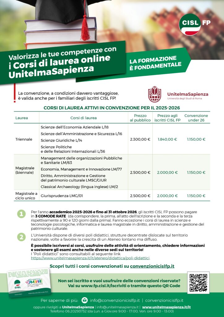 Con la riconferma dell’accordo è stato mantenuto un adeguato livello di formazione non solo per l’iscritto, ma anche per il suo nucleo familiare. In questo modo, attraverso la convenzione in oggetto, contribuiamo attivamente al contenimento “concreto” dei costi familiari. Elemento da non sottovalutare vista sia l’inflazione che le difficoltà che stiamo incontrando ad esempio per il rinnovo dei CCNL del Comparto Sanità e Funzioni Locali. Scegli di formarti con i corsi di laurea triennale e magistrale, i master e i corsi di formazione di Unitelma Sapienza, l’università telematica della Sapienza di Roma. Puoi frequentare le lezioni online a distanza, quando vuoi, in modo da conciliare lavoro e vita privata, scegliendo uno tra i corsi di laurea disponibili nell’area giuridica o economica; o i master in area sanitaria, socio-politica, tecnologico-gestionale e giuridico economica. Potrai iscriverti in ogni momento dell’anno, seguire le lezioni, usufruire delle attività di orientamento, chiedere informazioni e sostenere gli esami anche in uno dei 29 poli didattici sul territorio. Il tutto a un prezzo davvero vantaggioso, con sconti superiori al 20% e la possibilità di pagare in tre comode rate. La convenzione è valida anche per i familiari degli iscritti! Non perdere un’opportunità unica per la tua crescita personale e professionale. Per maggiori informazioni